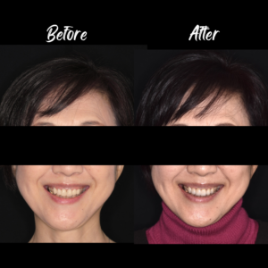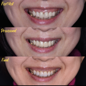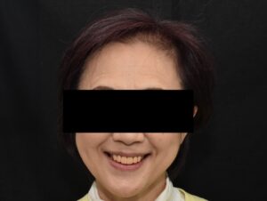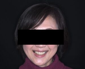 調整後、患者様の笑顔が劇的に美しくになりました。ちなみに歯の真ん中の正中は若干顎が傾いている右側に傾けて製作しています。Facial Flow Concept (Silva 2018) と言われており、より願望に調和するように考慮しております。あとは、実際に使用していただいて清掃性や機能的に問題ないか観察していきます。