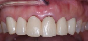 写真からもわかるように、右上一番の歯は前医で矯正的に引き出した(挺出)ので根が細くなっています。従って、移行的に被せ物を立ち上げた時に、歯と歯の間に大きな空間ができてしまうようになりました。この隙間をブラックトライアングルと言います。患者様はわたった時に歯茎が見えますので、この隙間は審美的に大きく影響してしまう結果となりました。
