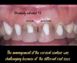 右上の1番は前医で矯正的に挺出させた状態だったので、根の幅径が他の歯より小さくななっており、理想的な歯の形態の付与や歯茎の隙間のマネージメントがとてもチャレンジングなケースでした。確認用の新しい仮歯に入れ替えました。患者さんの希望で色は少し暗めにしてあります。原則、被せ物は根の部分から移行的に立ち上げなければなりません。清掃性が悪くなったり、歯茎が押されプラークに関係なく歯茎が腫れることがあります。