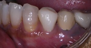 写真からもわかるように被せ物と歯の境界(マージン)が合っておらず、歯根が露出しているような状態です。根面の露出は虫歯になりやすいので、この場合、マージンは原則歯茎と同じ高さか0.3-0.5 mm程、歯茎よりやや縁下に設定します。
