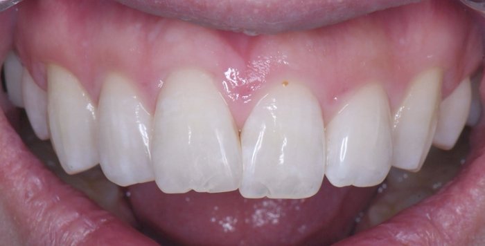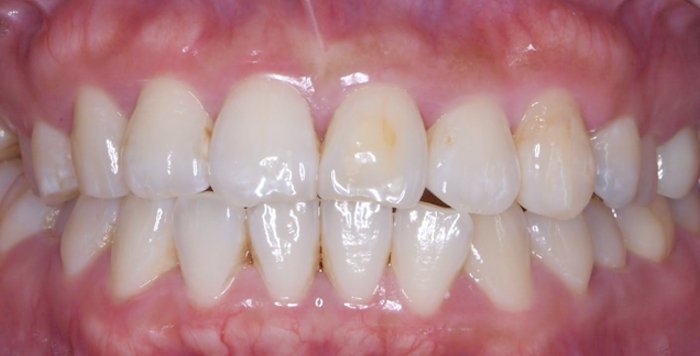 | 治療内容 | エナメル質形成不全や脱灰による着色を削らず、酸で溶かし、その後樹脂(レジン)を流し込んで修復しました。Resin infiltrationと言われている方法です。DMG社のIcon(アイコン)という製品を使用します。 削らずに着色部が改善しています。少し色が残っているところだけレジンで修復する予定でしたが、患者様が満足されたため、ひとまず終了となりました。 |