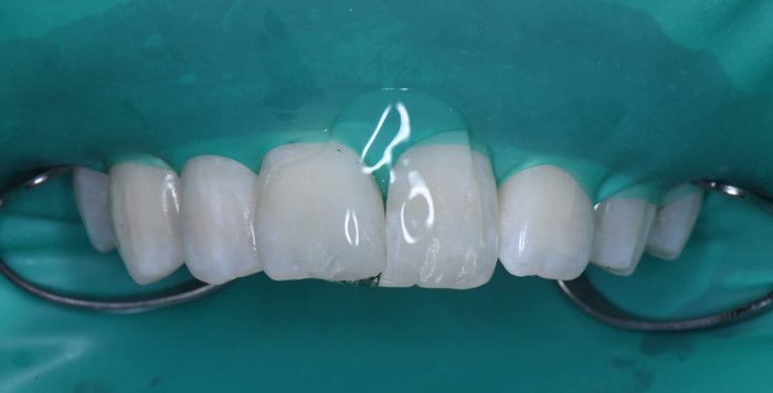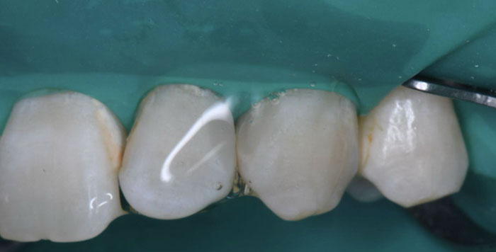 ダイレクトボンディングは、中間層を介さずに材料が表面に直接接着するプロセスを指します。歯冠色に近い樹脂(コンポジットレジン)を直接口腔内で築成していきます。水分があると接着力が低下するため、Technique sensitive(技術的にデリケート)と言われる由縁です。